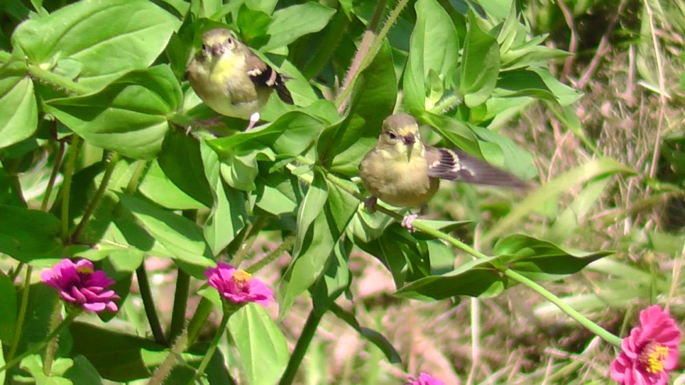 九月初的一天,听到窗外轻快的鸟叫声从zinnia 花丛中传出,此起彼伏,鸟声连续不断,密实得透不过一丝风。探头看出去,几只淡浅绿黄色的goldfinches 歪歪扭扭的站在Zinnias 花枝上,啾啾叫个不停,时不时猛扇翅膀。花丛里有一只黄色goldfinch 低头用心忙着在揪花,原来鸟爸爸带着刚学会飞的小小鸟们来采食了。