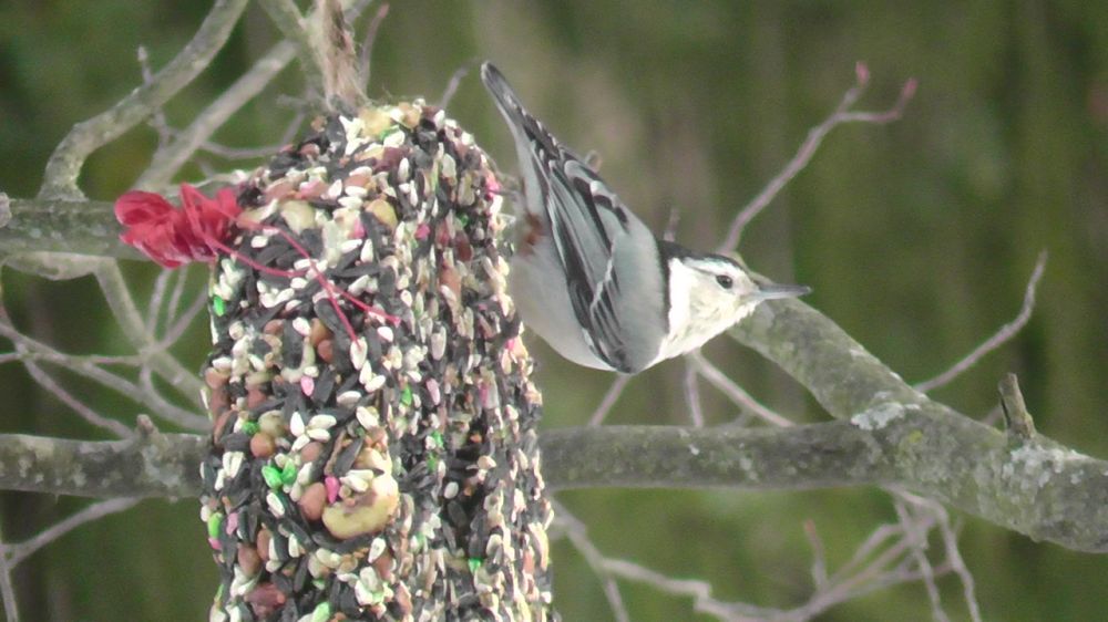 刚将彩色的圣诞花环挂在树上,五分钟不到,downy 琢木鸟(而且是位女士)就驾到。接着是nuthatch, 当然好事情总少不了black-capped Chickedee。不善于高空作业的darked-eye junco 也凑过来看看,American gold finch 上上下下找它喜欢的草籽, 连羞涩的Carolina wren也在花环上找食,甚至不爱凑热闹的红衣大主教也放下尊贵的身段,过来看个究竟。