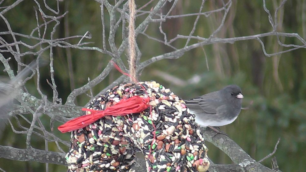今年的圣诞节,我得到的礼物,或者说院子里的鸟们得到圣诞节礼物,是一个新的鸟食堂(bird feeder),还有一个重两磅多的圣诞“花环”。花环是由黑油葵花籽,花生米,杏仁,红小米粒,红花籽,和果冻黏成。