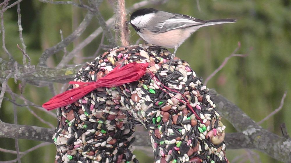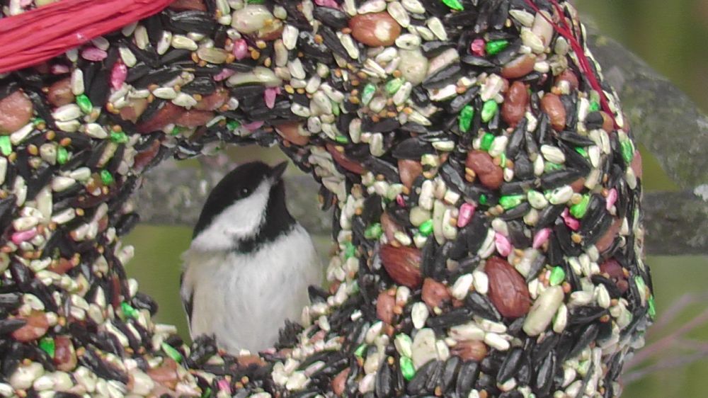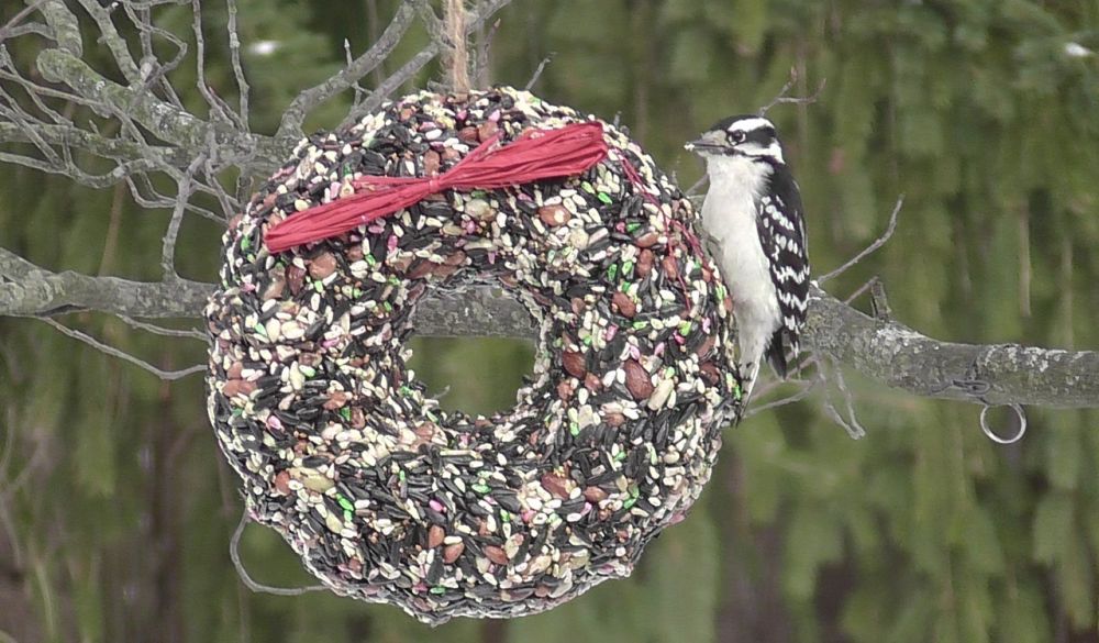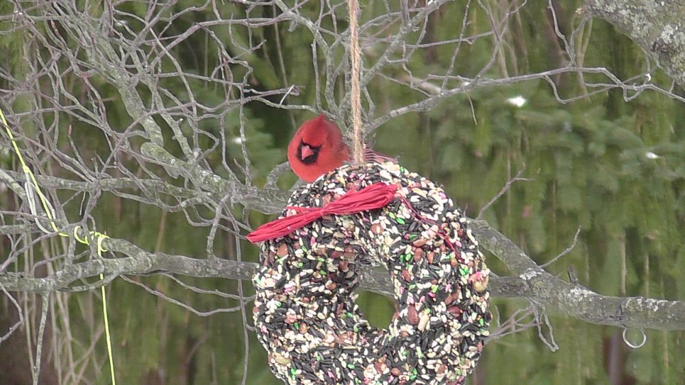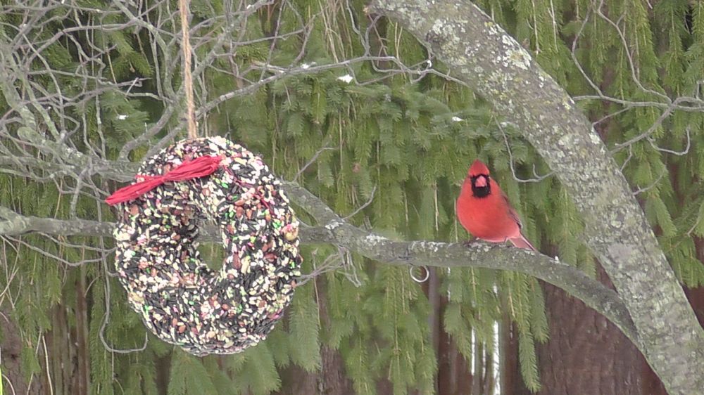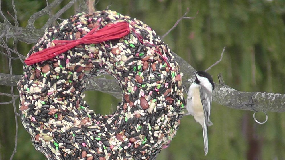 爱八卦的chickadees和nuthatch肯定会告诉林子里众多的小伙伴,说阿邕的院子里有一个大大的甜甜圈,一个寒冬腊月里在风里荡来荡去有圣诞颜色好吃的甜甜圈…