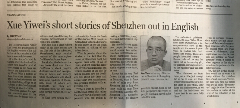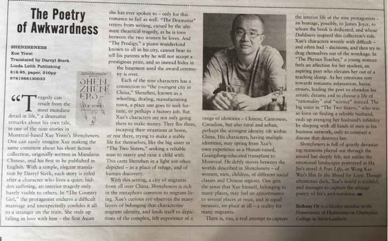 导语:薛忆沩是当代中国文学界最为勤奋和最受关注的作家之一。在过去五年时间里,他“高潮迭起”,一共出版了近二十部受知识界推崇的文学作品。他特立独行,被称为是中国文学界“最迷人的异类”。同时他又深居简出,尽管已经在加拿大蒙特利尔居住多年,却不为海外的读者所熟悉。去年年初,在美国注册的英语学术期刊Chinese Literature and Culture杂志以整期全部110页的篇幅推出专辑“Xue Yiwei and His War Stories”,薛忆沩不同凡响的作品开始引起西方读者的注意。而随后不久,他被国内读者推崇备至的“深圳人”系列作品英译本Shenzheners在蒙特利尔正式出版,引起加拿大主流文化界的关注。从去年七月以来,The Montreal Review of Books, Quill & Quire, The Globe and Mail, The Montreal Gazette, Literary Review of Canada, Montreal Center-Ville等主流媒体纷纷发表书评和访谈(蒙特利尔当地最大的英语报纸上的访谈近一个整版),将薛忆沩的“深圳人”系列作品与英语文学中的经典《都柏林人》相媲美。加拿大国家广播公司(CBC)也制作了关于薛忆沩的专题报道,在星期天黄金时段播出。薛忆沩多次获邀在加拿大各地文学节和图书馆朗读和解读作品。在名家云集的温哥华作家节上还出现了读者排队购买和签名的热烈场面。英语的China Daily, That’s Beijing等报刊相继发表了报道、书评和采访。香港《亚洲周刊》杂志将Shenzheners 的“西方接受”当成封面故事之一进行了报道。据悉,新年假期刚结束的第一天,CBC的读书节目又做了最新的报道。蒙特利尔的“蓝色都市”国际文学节与多伦多的公立图书馆也发邀请,还有法国出版社拟推出法语版……在“深圳人”走向世界之际,红杉林策划特辑,增进读者了解作家与众不同的文学道路和超凡脱俗的写作风格。