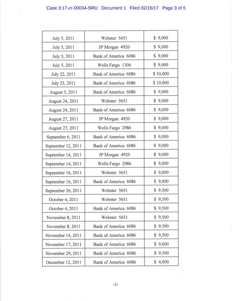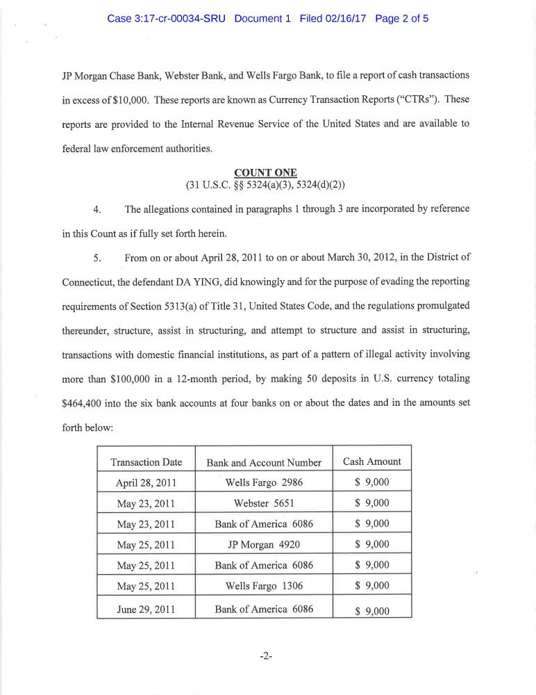 从美国康涅狄格州联邦检察官办公室对英达的起诉书中可以看到,英达在知晓进行超过1万美元的现金存款需要上报的情况下,在2011年4月至2012年3月之间进行了50笔低于1万美元的现金存款。英达承认这样做是为了规避上报要求。英达存入银行的款项金额总计为46.44万美元。在康涅狄格州的四家银行分别于2011年存入了34.68万美元,2012年存入了11.76万美元。英达的详细存款记录可参见起诉书的第二页至第四页。