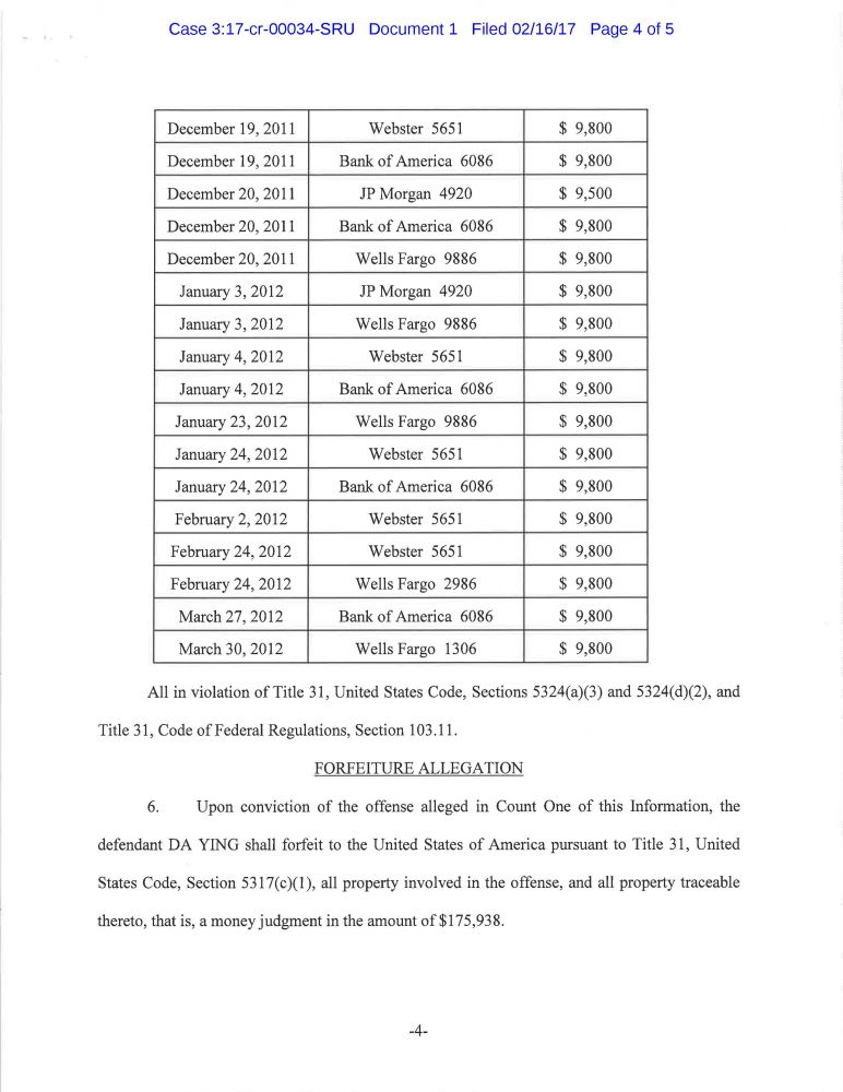 按照英达起诉书的说法,美国联邦检察官指控他违反了两条美国联邦法律:31 U.S.C.5324(a)(3)及5324(d)(2),成规模的进行金融交易并规避金融交易的报告要求。