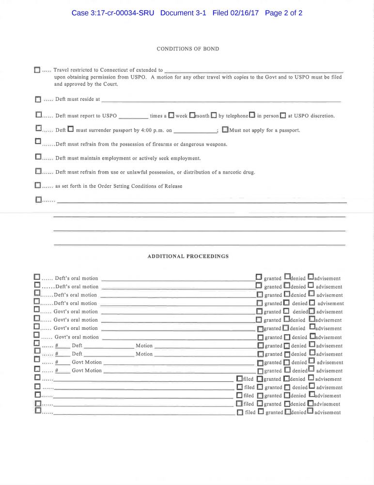 《美国说法》得到了英达2017年2月16日在美国康涅狄格州联邦法院的庭审记录,如下面图二所示。从这份庭审记录中我们可以看到,英达的判刑日期定在2017年5月11日。在庭审记录的第二页的第一项中没有对英达的旅行加以限制,第四项也没有要求英达交出护照。所以说法庭并没有限制英达旅行。