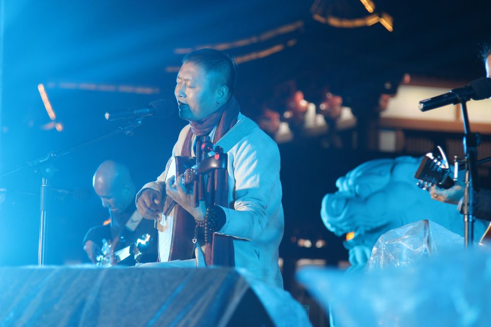 10月30日晚上7点,经过两个月辛苦排练的冯言和其他四位乐手终于在宝林寺观音阁前登台。那天早上,久雨的天空突然升起了太阳,并且一整天都是阳光普照,我满心感恩。可是到我们演出的时候,雨突然下了起来,并且有越下越大的趋势,看着雨中弹奏中阮的冯言在两首歌之间都要用力地搓手,我痛惜而忏悔,禁不住流泪了。我跟师父说,是不是我业力深重?师父说,这是天降甘霖,观音菩萨要考验你,不可停止精进。