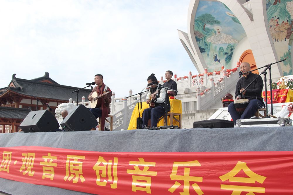 因为与宝林寺方丈的深厚法缘,我们一致认可原创佛教歌曲从观音法门开启。冯言的创作速度非常快,只用了两周的时间,就写下了有关观音菩萨经诵、赞偈的十首歌曲。在练唱的过程中,有时冯言抱着吉他到我的茶室边喝茶边弹唱,他的姿势表情和他的声音一样宁静;有时我也会到他的院子里听他弹唱,我们几个人一起坐在院子中间,从黄昏到夜晚,天上的星星和隔壁院子的犬吠都不影响我们的唱和听,连蚊虫的叮咬也无所谓了。慢慢地,组建乐队去寺院演出的思路越来越清晰,于是我电话中跟师父沟通,师父当即认同,并大加赞赏。于是我们开始添置乐器、法器,进入排练。