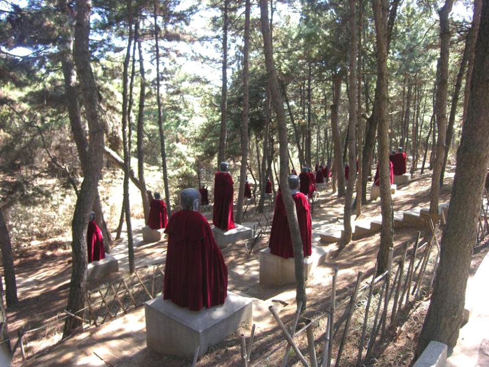 从山上往下时,我们走到了一个岔道上,似乎游人罕至,路边的树林中伫立着大小十几尊佛像,佛像的身上都披着红色或黄色的披风,像是古代即将出征的将士。我站立凝望,自言自语说,佛像需要穿披风吗?一同站立的阿嵘随口应答:也许是信徒心里需要吧。我看向阿嵘,他在这初春的暖阳下熠熠生辉。