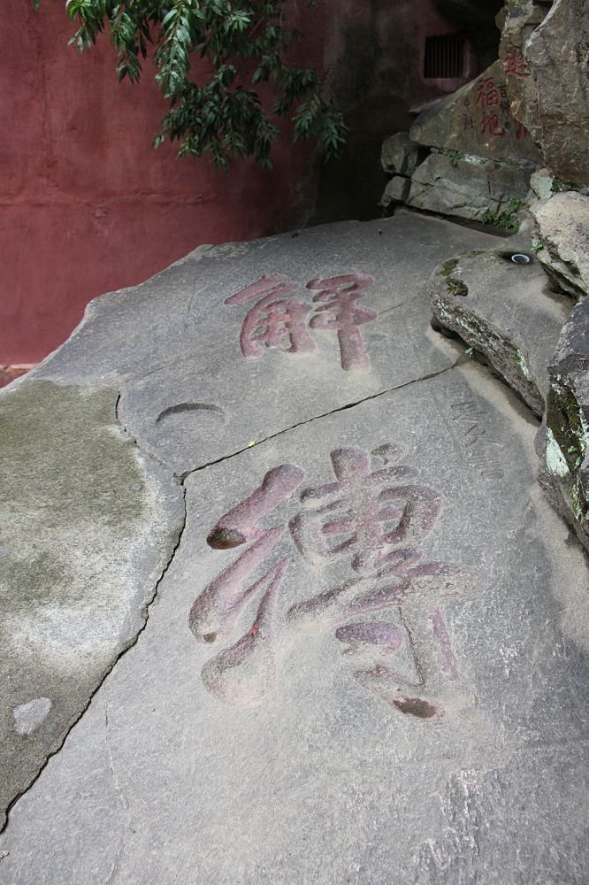 我们进的是后院,三祖洞和解缚石离宽容法师的方丈院不远,我远远地瞥了一眼,见宽容法师没有停下,我也只好暂时舍弃不顾。“解缚”石其实是源于一段公案:当年,达摩传法慧可后曾授记他未来将有法难,当往南。后来果然周武灭佛,慧可逃到司空山隐居。僧璨最初以白衣的身份到司空山拜谒了避难的二祖慧可,并得到祖师的点拨、印可和传法,成为禅宗的三祖。三祖僧璨隐居天柱山时,十四岁的沙弥道信前来拜师,说:“愿和尚慈悲,乞与解脱法门。”僧璨说:“谁缚汝?”道信答:“无人缚。”僧璨说:“何更解脱乎?”于是道信大悟。