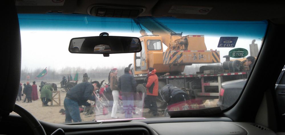第二次拍摄通过之后,我跟着唐导和一众演员又转到二百米之外的另一个场地拍摄。因为来前完全没有预估到郊区的风大和低温,我穿的比较单薄,唐导看我被风吹得发抖,就让司机把车开过来,让我坐在车里等待。从前窗玻璃我看到唐导在跟黄晓明说戏,也许在商量下一场戏的细节,他们谈了很久,到当天的戏拍摄完成后,天已黑了下来。