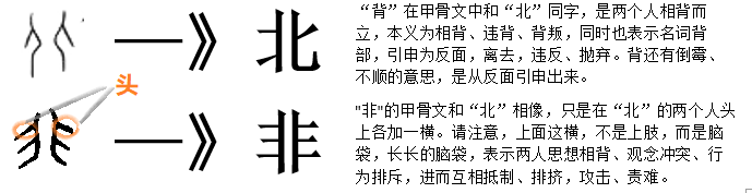 “北”和“非”与“从”、“比”、“并”一样,都是由两个人组成,只是方向有别。方向之别便是天壤之别。