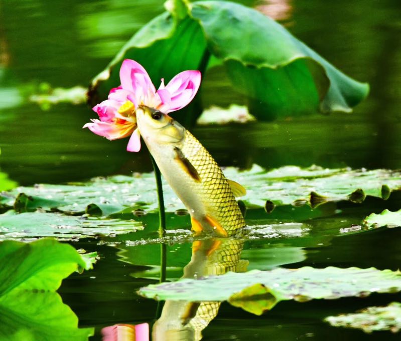 前阵在诗坛看了这张鱼吻荷的照片,激发了创作热忱,写了这首歌。照片版权归原作者。