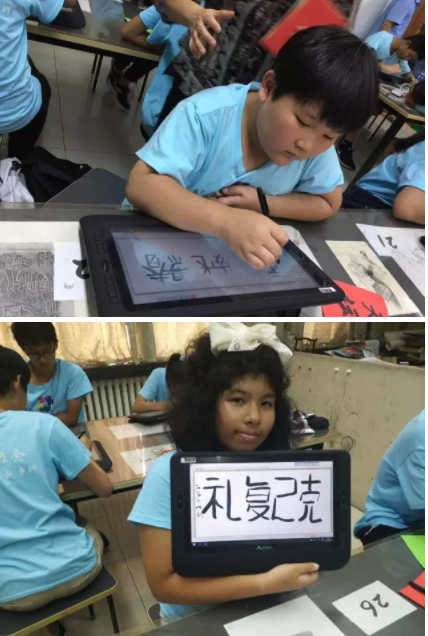 今天营员们要体验的是电子书法,通过具有压感功能的电子屏和笔,如同书写在真实的宣纸上,大家即刻能够在电子显示屏上看到自己的书写效果,并通过打印和网络模块,对书写的内容进行盖章、保存、打印、分享。