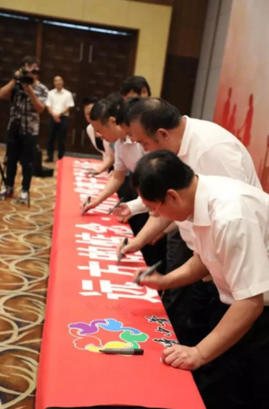 出席领导及嘉宾在夏令营条幅上签字。