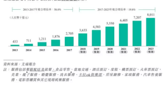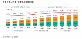 从美团点评目前收入占比最大的餐饮外卖分析,根据艾瑞报告,2017年,中国食品零售和服务行业规模约为人民币8.7万亿元,在线渗透率为13.4%;根据艾瑞报告,到2023年,其规模将达到约人民币14.1万亿元,在线渗透率达29.5%。