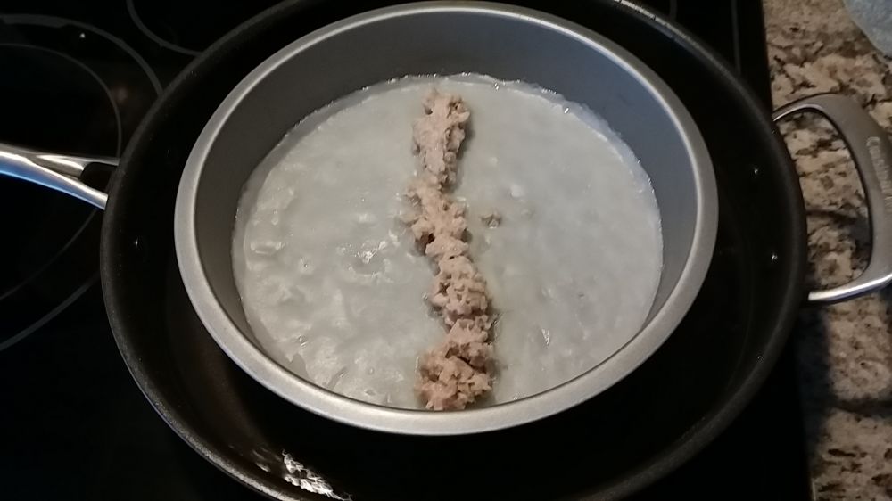 5. 蒸锅入水,开火。置入平底空盘蒸热,盘底抹油。检查一下盘子,尽量放置水平。水开后,放入肉馅,一勺米浆。加盖,猛火蒸三四分钟。