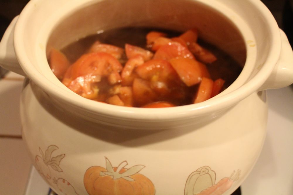 6. 加入切好的西红柿,再炖半小时左右,加入少许太白粉收汁