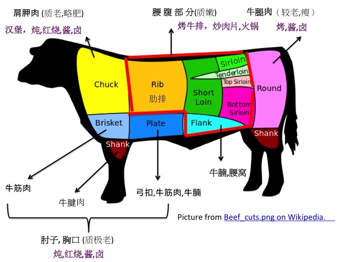 3. 下面是本姐姐根据网上和wiki搜到的牛肉各部位的英文对照图和适合的烹饪方式制作的一个简易图示,请酌情参考。
