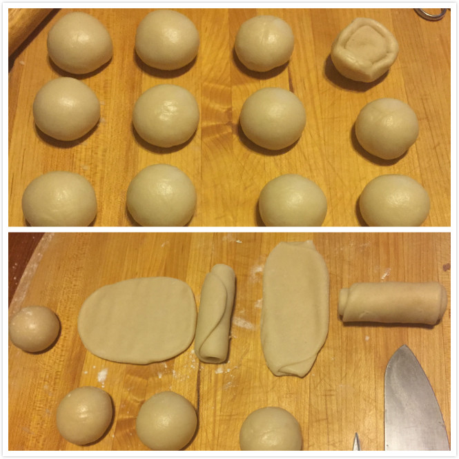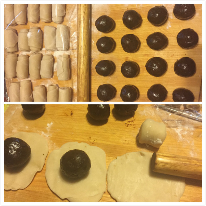 3.水油皮(15g)和油酥皮面团(10g)各自分成20等份,揉成圆球,然后大球包小球,虎口包法使里外紧密结合