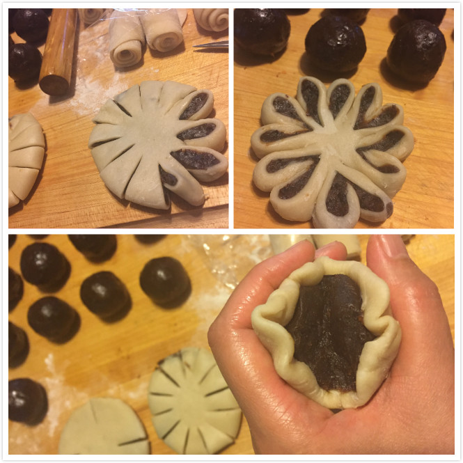 7.包好馅的面团压扁擀平(小心露馅~)用一个干净的剪刀,往圆心剪约2厘米长的口, 像风车一样先四等分,再分别在每个等分的四分之一圆里剪两刀最后剪出12片花瓣