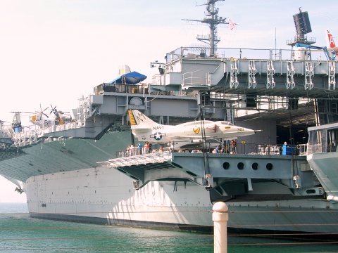 从Sea Port Village 出来,沿着海边往回走,就可以看到巨大的航空母舰停泊在那里,这是Mid Way 41航空母舰博物馆,因爲时间有限,我们没能进去参观。朋友告诉我,这艘航空母舰可以载75架飞机,里面F16丶F4战机都有。它曾经参加过越战和海湾战争,在1992年退役,现在还在爲人民服务,供游客参观丶游览。其实圣地亚哥有多处军事基地,有人称圣地亚哥是“海军航空兵的诞生处”名副其实。在战舰沿岸有一个公园,有阵亡将士的纪念碑,还有一个巨型“水手亲吻女护士”的雕塑,这是根据一位记者的照片创制的。在1945年8月14日,第二次世界大战结束的那天,一位水手高兴地在纽约时代广场,见到一位女护士,马上抱住她与她亲吻。这被称爲是“胜利之吻”丶“世纪之吻”。雕塑约有十多米高,在蓝天的映衬下,顔色格外鲜艳,造型生动。不少夫妇丶情侣学着他们的姿势照相。这真是不可错过的景点。再往里走,还有一组群雕,全部是黑色的。著名的好莱坞演员Bob Herb 在一群将士面前表演,他扬起手正在慷慨激昂,前面的人有的站有的坐,笑得前俯後仰。高音喇叭还不时传出Bob Herb真人的讲话声,我们仿佛身临其境.....