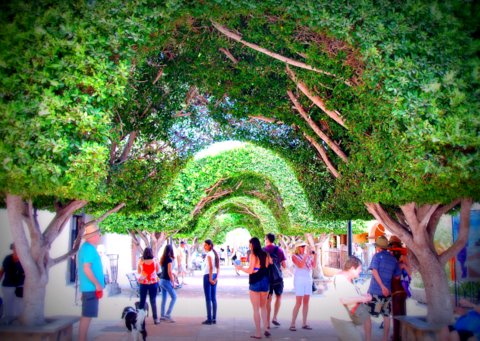 大约走了500米左右,右转去一条小马路,就到了洛雷托最古老的小镇。今天是星期六,小镇显得特别热闹。街道两边小贩在出售各种商品琳琅满目;餐馆里已经坐满了人,也许也有我们同船的游客。这里的酒比船上便宜多了,特别是墨西哥的啤酒和Margarita(一种鷄尾酒)。旁边有墨西哥特色的打击乐(很像中国的木琴)在空中回响,希望你驻足聆听,给他一些“奖励”。就连海螺也可以发出“呜....呜.....”的声音来,我本来想买一个带回去,可是他们将价钱涨了5倍,那我就放弃了。这个小镇有特色的树也是著名的,两边的树向中间弯曲,形成一个又一个拱门,一直接到街道的尽头,这样一环连一环,像一个天然的遮阳物。在下面行走,凉快无比。