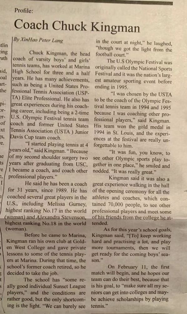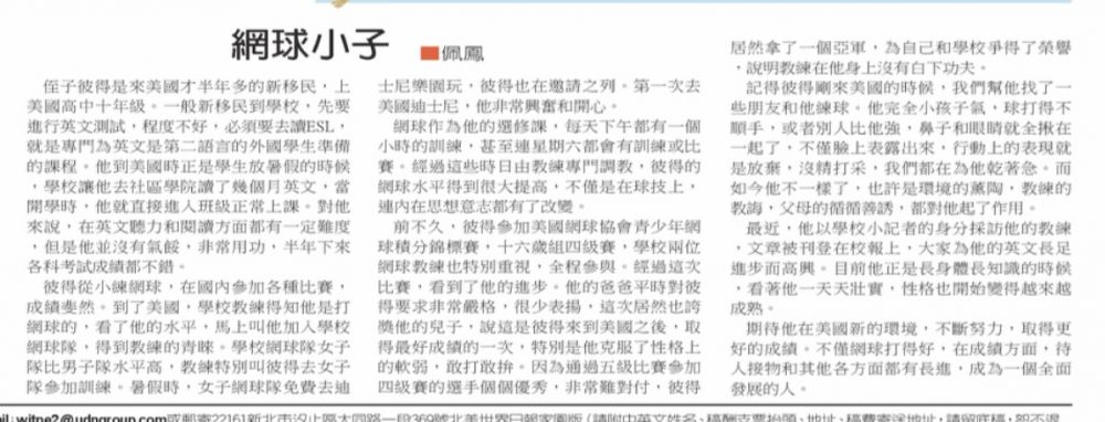 前不久彼得參加美國網球協會青少年網球積分競標賽,16嵗組四級賽,學校兩位網球教練也特別重視,全程參與。經過這次比賽,看到了他的進步。他的爸爸平時對彼得要求非常嚴格,很少表揚,這次居然也誇獎他的兒子,說這是彼得來到美國之後,取得最好成績的一次。特別是他剋服了性格上的軟弱,敢打敢拼。因爲通過五級比賽參加四級賽的選手個個優秀,個個非常難對付。彼得居然拿了一個亞軍,為自己和學校爭得了榮譽,説明教練在他身上沒有白下功夫!最近由美國網協舉辦的一年一度南加州高中男生網球分區賽中(八所高中),彼得以一號種子選手的身份,橫掃各隊的一號選手,均以八比零、八比一勝出,幫助學校拿到了男團冠軍。目前學校正進入賽季,希望彼得再接再勵,為學校爭光!