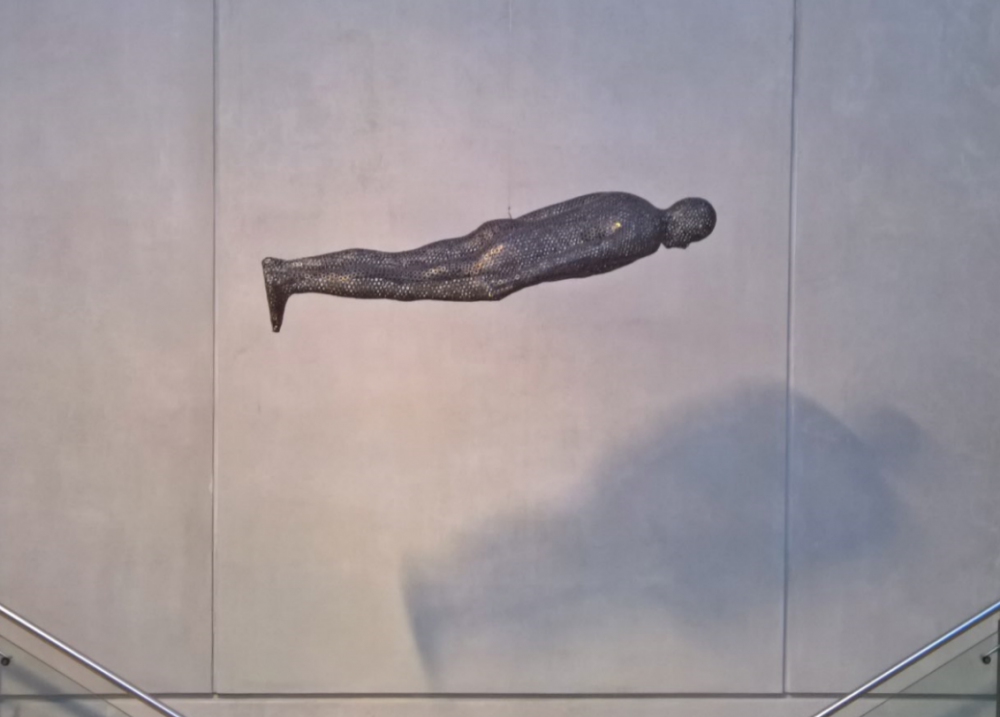 下面这个是视频是进上面那个展厅(右手侧)前拍的。这个悬挂雕像是 英国当代 雕塑大师 Antony Gormley 的作品,Filter(2002)。Manchester Art Gallery于2009年,£80,000买的。Antony Gormley最著名的雕像是立在Newcastle城外的North Angel(Kevin)。下次有机会专门介绍Gormley。平时没见这东西转这么大的幅度,一般都不动。
