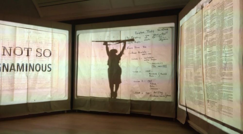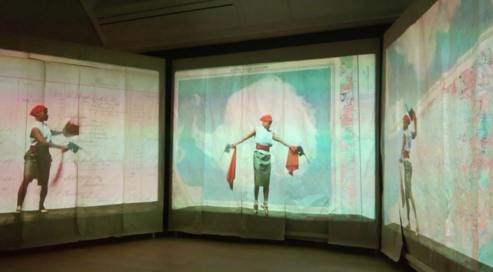 关于文革的短片,参与人员无一人来至中国。影片里出现的演员全是非洲裔。用的中国地图是东北腹地和中原腹地,不知道有什么寓意。里面出现了William Kentridge的标志性Indian Ink 画鸟的形象。电影里的这本书在展厅的桌子里有展出。配乐很有60,70年代的风格。看得时候,很难想象是2015年的作品。