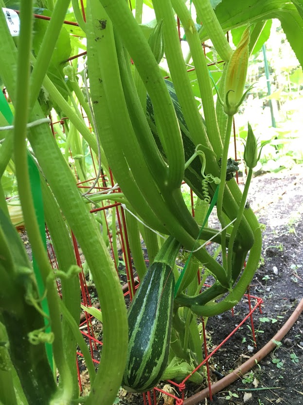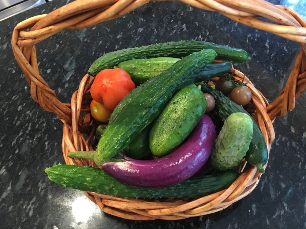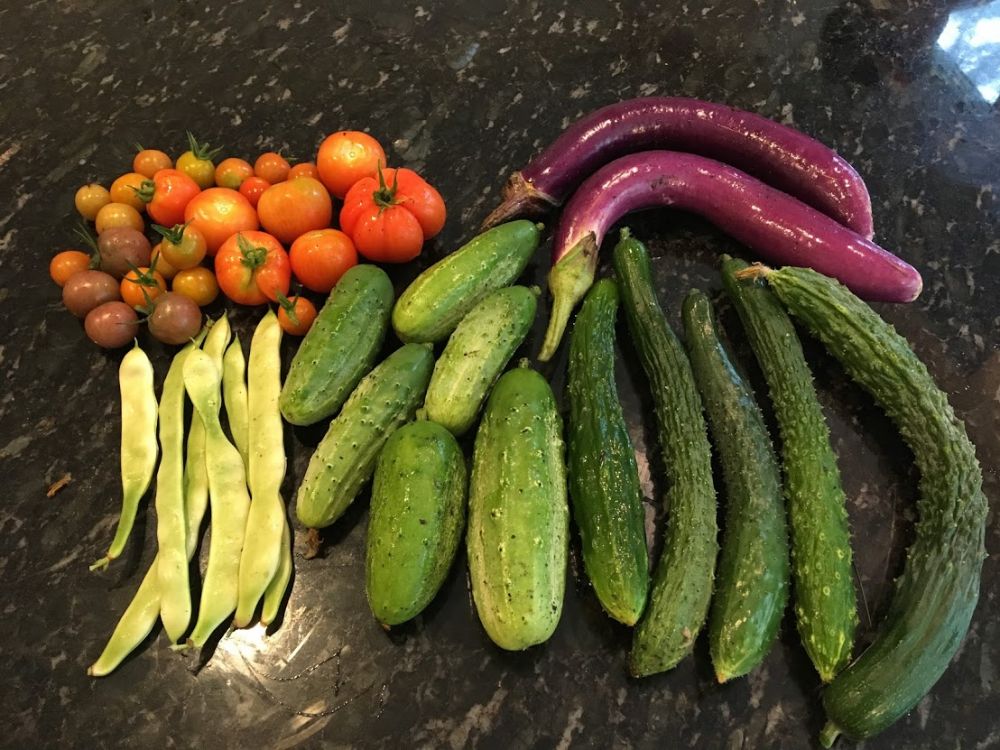 具体内容有最早的两根屏东长茄,每次还挺给力的黄瓜(national pickle/beijing long/palace king/天津小胡瓜四个品种),一堆小蕃茄(fouth of july, super sweet 100, sungold,第一颗champion,开始逐渐成熟的chocolate cherry,我的最爱),还有第一把的东北油豆角(希望豆角开始发力)