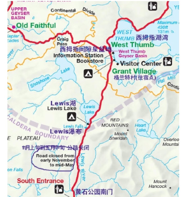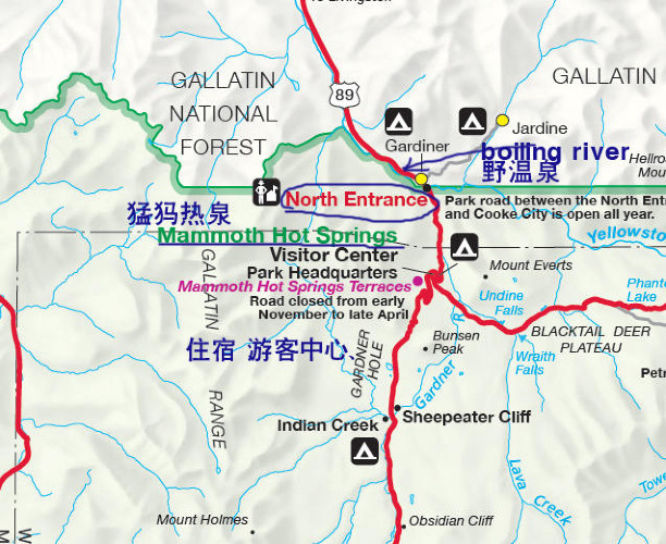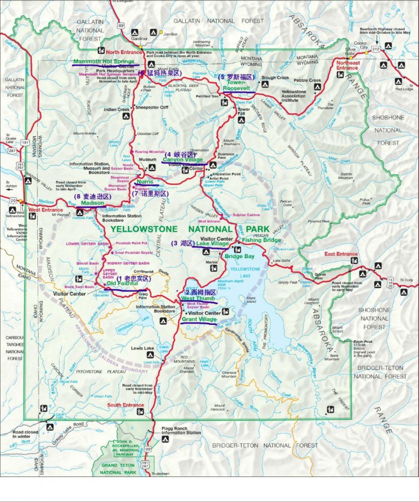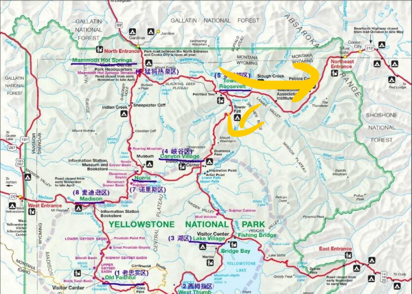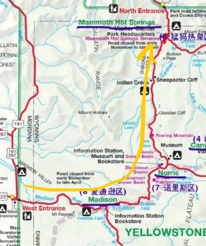 黄石公园分八个景区,下图上都有标实。我们从西门进园子, 准备一路向北,第一天玩Madison—Norris—Mammoth Hot Spring。
