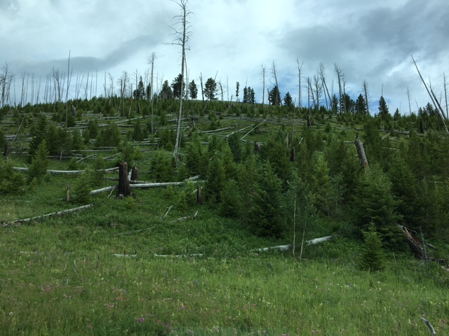 回旅馆的路我们开了一段Tower Roosevelt (North East): 大面积开阔的森林、草地、舒缓的山峦,瀑布、 火灾后的干枯森林,开阔起伏的山峦,路边成片的鲜花,景色很美,只可惜我们为了赶路,没有下车欣赏。
