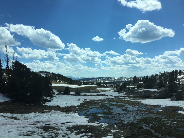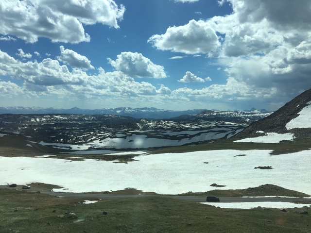 我们看到了美国野牛,熊,还有狐狸。LamarValley接着往东开就是熊牙公路The Beartooth Highway,据说是全美票选出最美的公路 之一,也是黄石国家公园东北入口主要道路,是在 黄石公园东北门外cooke City到Red lodge这一段的212号公路,全长69英里(110 公里),也是美国本土海拔最高、最崎岖的公路之一。这条路道路陡峭,所以每年 只有5月底(Memorial Day)至九月初(Labor Day)这期间才会开放。我们开了近20Mile到达山顶就返回了。沿途风景以湖光 山色、高山流云为主,爬到2400米的高度以后,温度寒冷没有树木生长,只有辽 阔的天地和墨绿的耐寒植被,蔚为壮观。开到山顶,一片白雪皑皑,对于孩子们来说还有什么比这更好玩的,一下车,他们就往雪里奔,我们赶紧让他们穿上厚衣服。