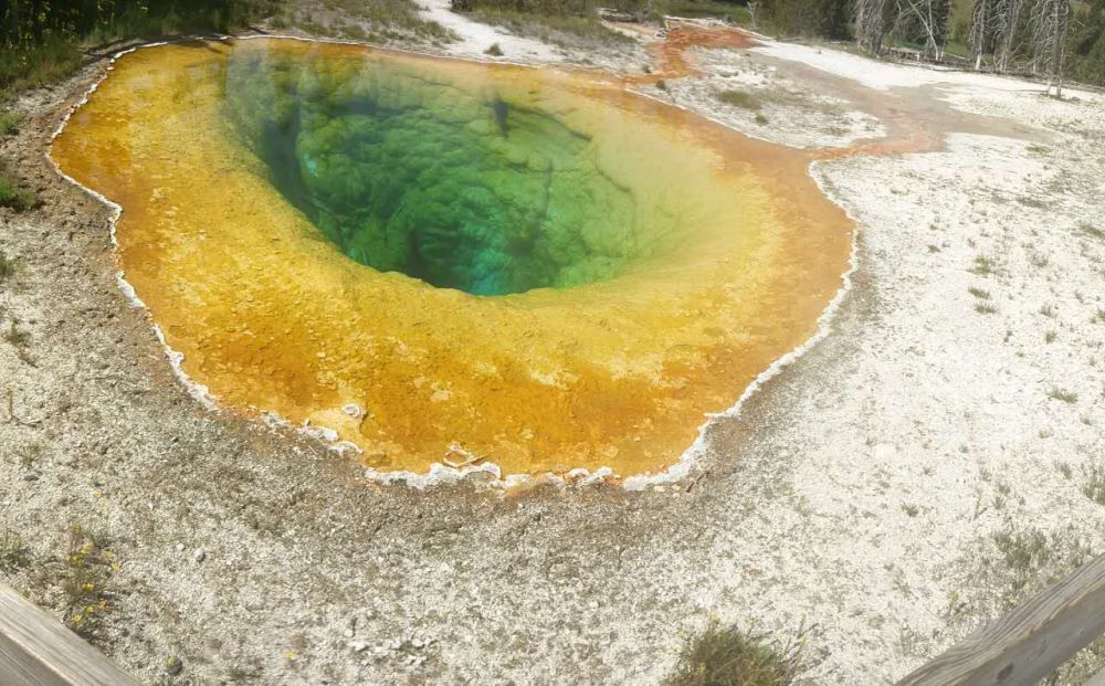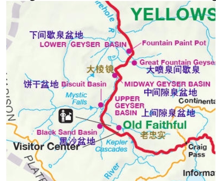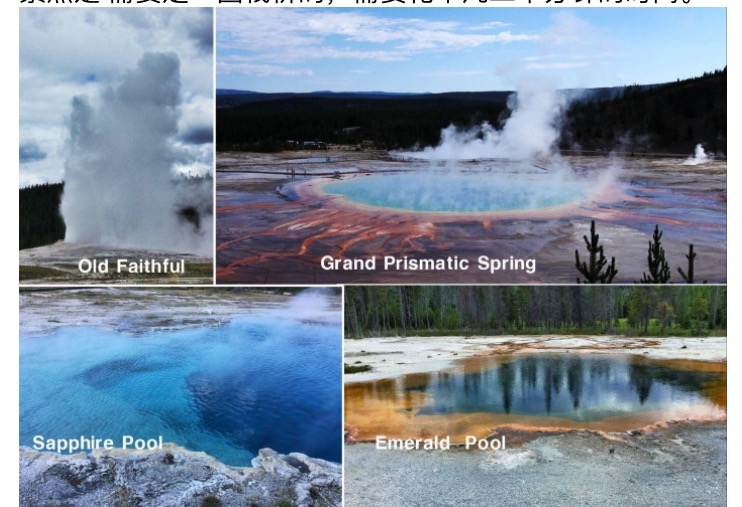 Biscuit Basin: 蓝宝石池(Sapphire Pool) * Fountain Paint Pot: * Midway Geyser Basin: 这个景点是比较壮观的,有大温泉,颜色很特别,也是一 圈栈桥的,最大的地热在里面。不要错过牵牛花池(Morning Golory Pool)
