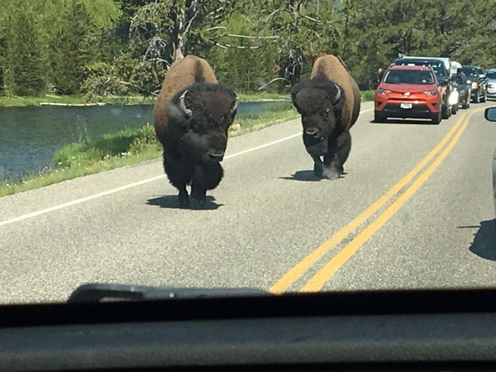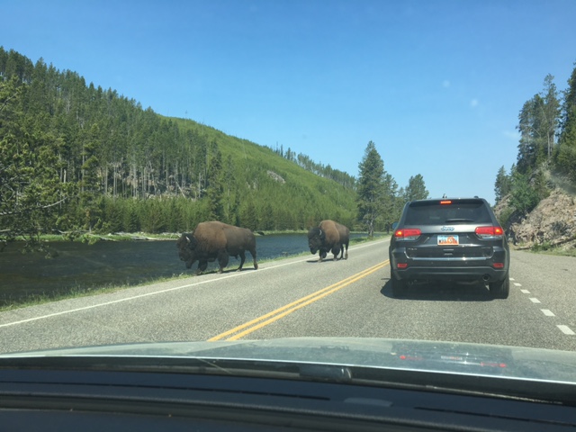 八家人,七辆车,黄石公园里没手机信号,怎么跟车,怎么联系。 我们买了Walkie-Talkie,一家一个在手,见面调成统一的频道,就可以彼此通话了。当然我现在说的很轻松,实际操作起来还是问题多多,第一天进园子,我们就全部失散了。原因无它,进园子买门票堵车半小时以上,大家分排几条Lane买门票,一过园门,手机立马无信号,而Walkie-Talkie的工作范围有限。大家堵了那么长时间,好容易能开车了,肯定是撒丫子跑得飞快,等到想起与别的车联系,已是白日痴梦。