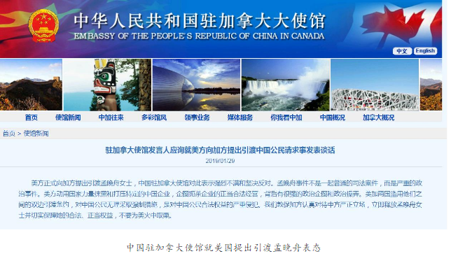 美方正式向加方提出引渡孟晚舟女士,中国驻加拿大使馆对此表示强烈不满和坚决反对。孟晚舟事件不是一起普通的司法案件,而是严重的政治事件。美方动用国家力量抹黑和打压特定的中国企业,企图扼杀企业的正当合法经营,背后有很强的政治企图和政治操弄。美加两国滥用他们之间的双边引渡条约,对中国公民无理采取强制措施,是对中国公民合法权益的严重侵犯。我们敦促加方认真对待中方严正立场,立即释放孟晚舟女士并切实保障她的合法、正当权益,不要为美火中取栗。
