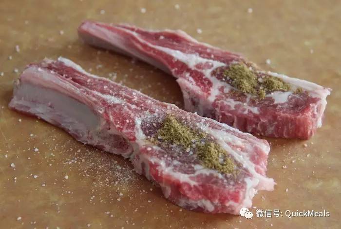 把现磨的海盐和孜然粉均匀抹到小羊排两面。
