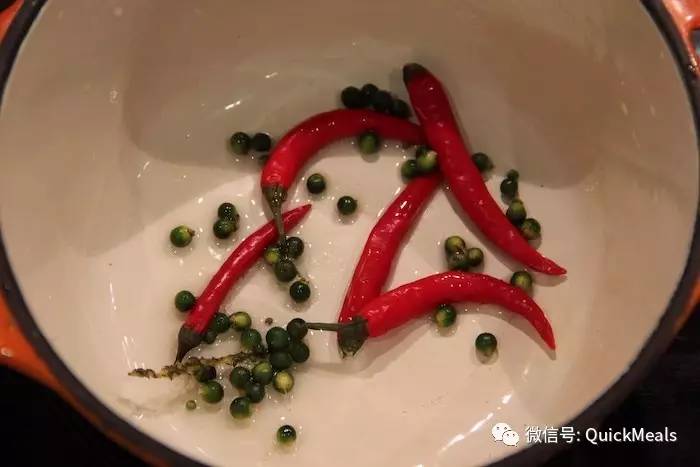冷锅冷油,小火慢慢熬出辣椒和花椒的油。