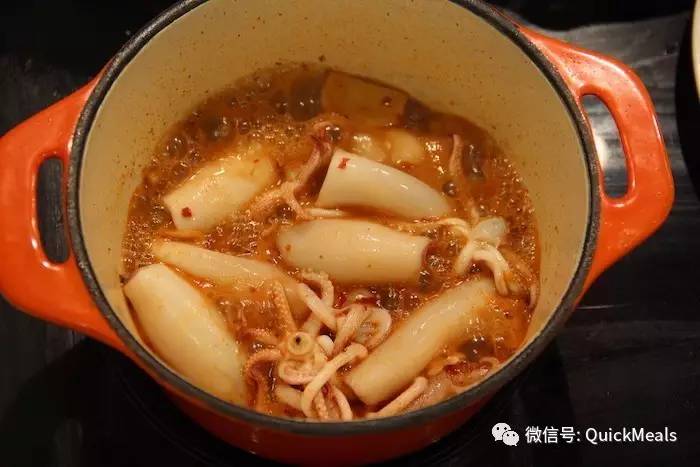 加一碗鸡汤,大火煮沸,加入小鱿鱼煮5分钟。