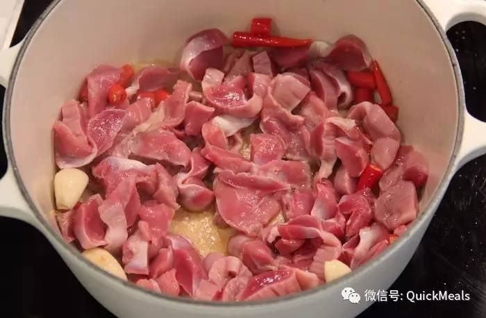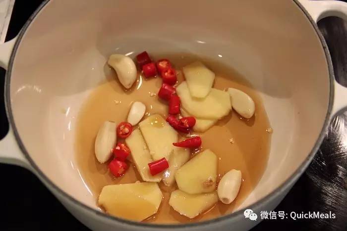 锅大火加热,倒入麻油,大蒜,辣椒和姜片爆香。