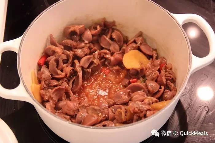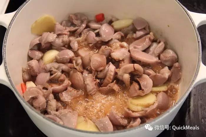 等到鸡胗变色,倒入料酒,酱油和红糖。