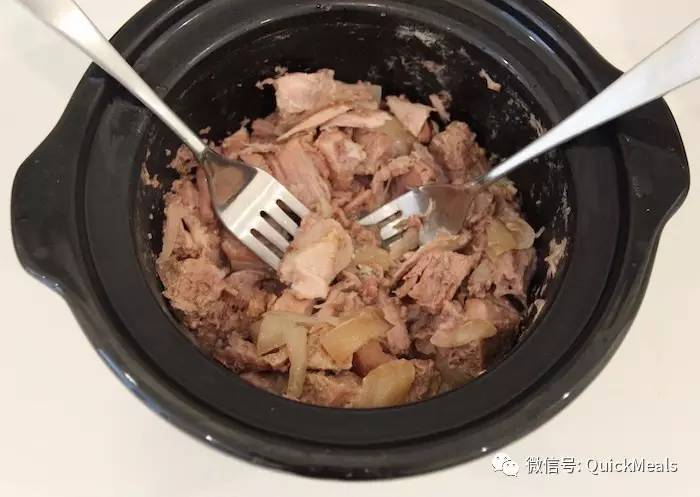 开饭前半个小时,把汤倒出来,用叉子把肉分开成丝。 汤可以放冰箱里用来做面条什么的。