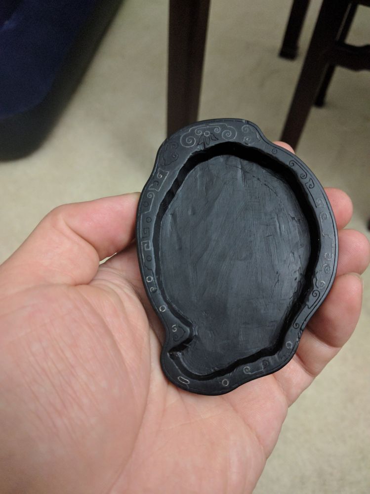 另一件则充满了期待。网上图片看不清材质,但见手掌大小的个小托盘,居然边缘和侧面镶嵌银丝,想来路份不低。期待最好是件头奖紫檀。打开包裹却没闻到紫檀特有的香味,兴扫了大半。却是件乌木,也算是没有亏本。