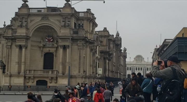 广场四周,庄严的建筑依次围绕:北面是宏伟的总统府(Palacio de Gobierno),东侧是金碧辉煌的利马大教堂(Catedral de Lima),南边是市政厅(Municipalidad de Lima),西侧则是大主教宫(Palacio Arzobispal)。我们恰好赶上总统府前的卫兵换岗仪式。随着军乐声,身着礼服的士兵整齐列队,踏着整齐的步伐经过广场,仪式感十足,游客们纷纷举起相机记录这一刻。