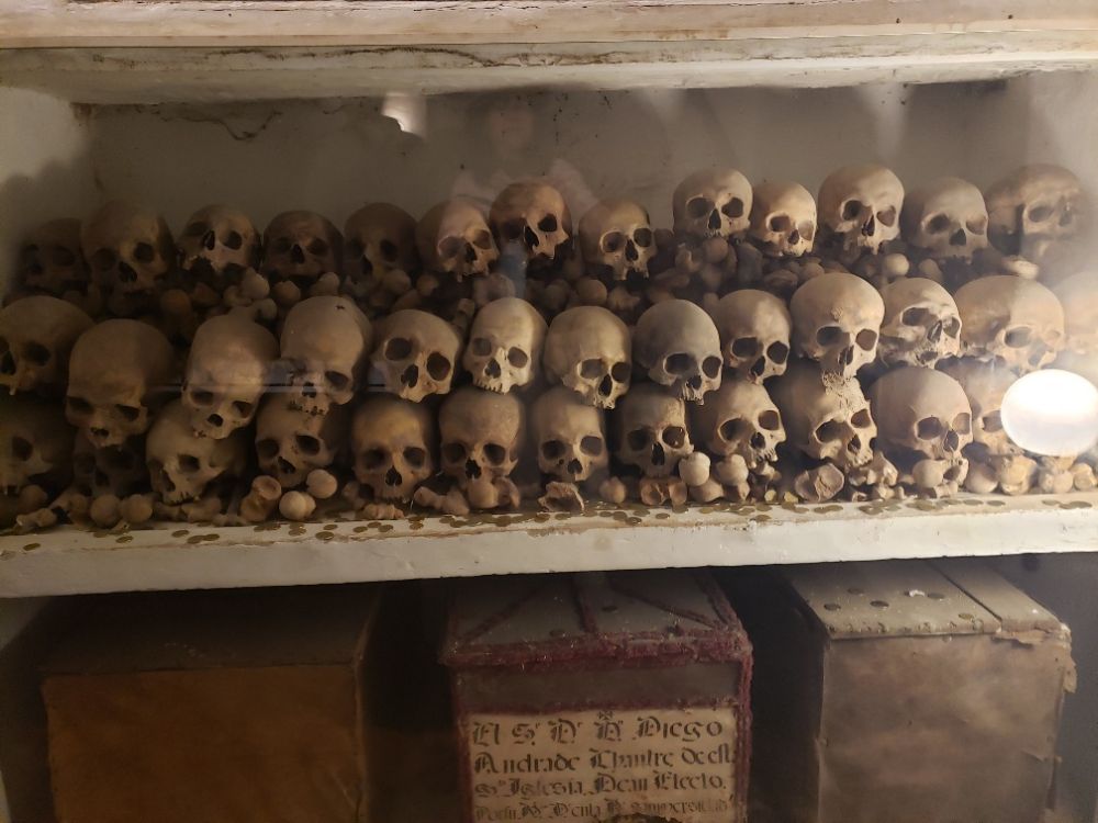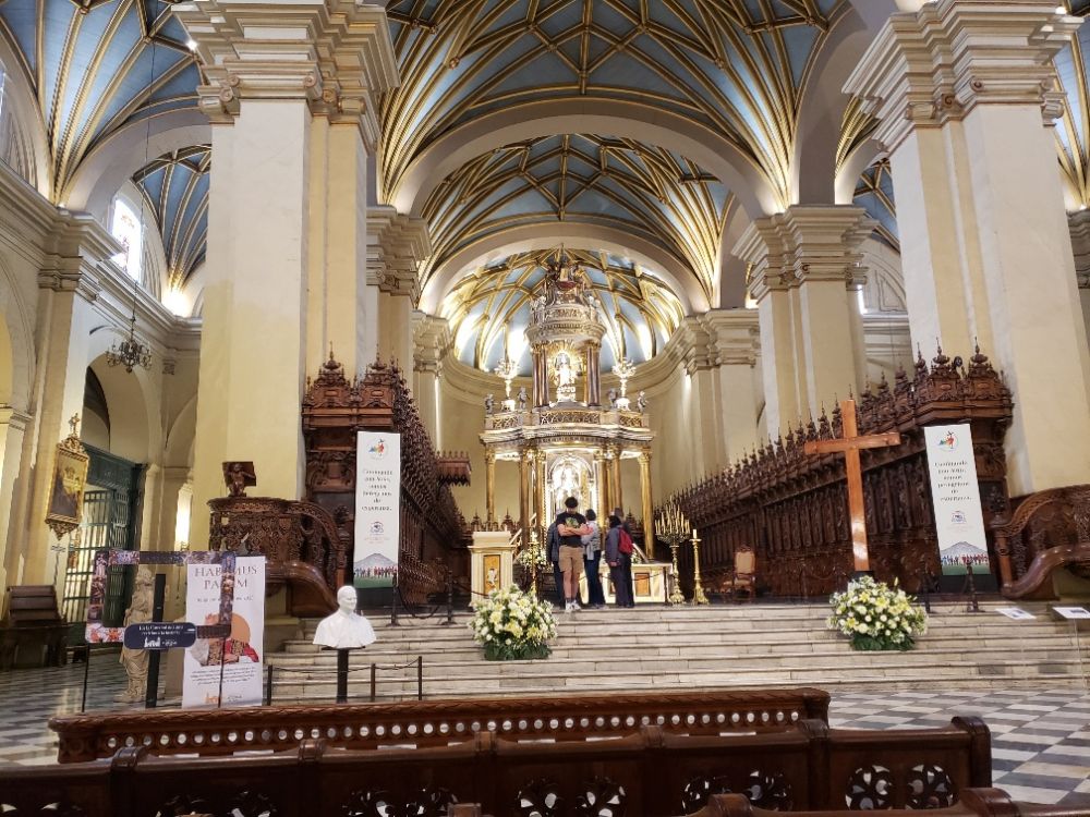 随后走进利马大教堂,厚重的历史气息扑面而来。教堂最早由征服者皮萨罗下令修建,历经地震与修复,依旧保持着浓郁的西班牙殖民风格。高耸的穹顶、镀金的祭坛、精美的木雕座椅、墙上的宗教油画,都在静谧的光影中显得庄严而神圣。教堂内有几处入口通向地下墓穴,那里安葬着多位总主教和历史人物,甚至还有皮萨罗本人的棺木。昏暗的灯光照在厚重的石墙和古老的墓碑上,几处还依稀能看到逝者的遗骸与头骨,那一瞬间仿佛时光倒流,回到了几百年前的殖民时代。