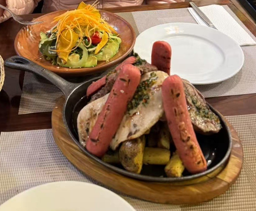 接着我们来到武器广场(Plaza de Armas),这是库斯科的心脏。广场宽阔大气,四周环绕着古老的教堂和殖民风格的建筑,气质厚重而沧桑。与利马的武器广场相比,这里少了几分富丽堂皇,却多了几分历史的沉淀。其实,两天前的晚上,我们就已经在这片广场的餐厅用过餐。那顿晚餐儿子点了秘鲁打卡美食烤豚鼠牛肉鸡肉火腿肠四肉荟盘尝鲜,豚鼠肉质有些发“猩”,带着独特的味道,不如牛肉来得香醇,却是秘鲁的特色美食。