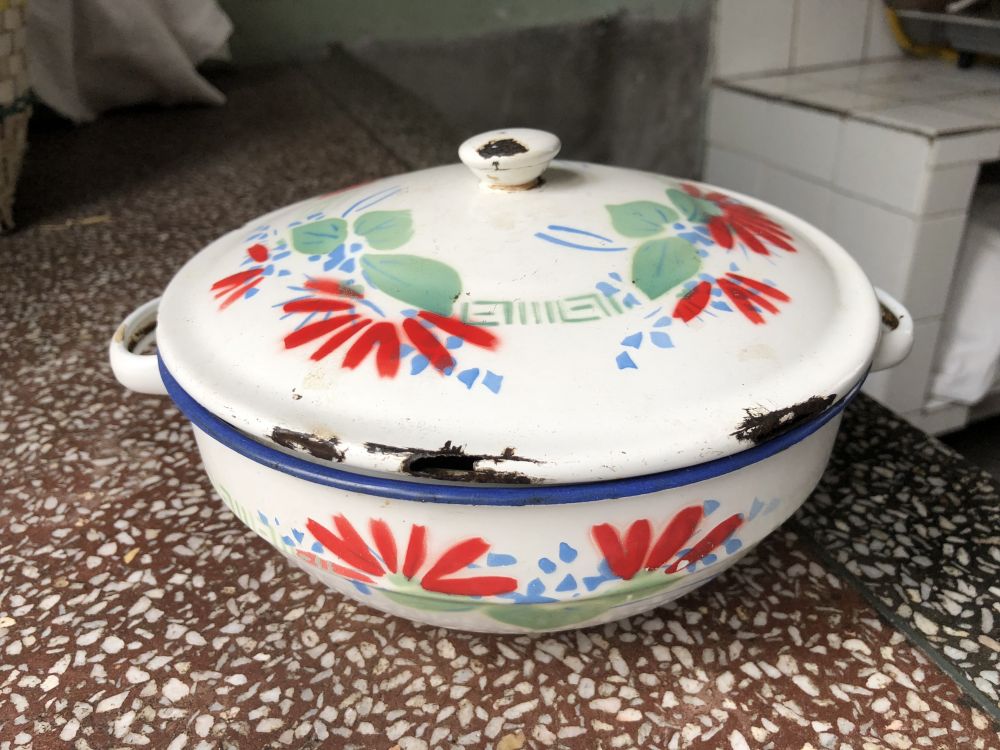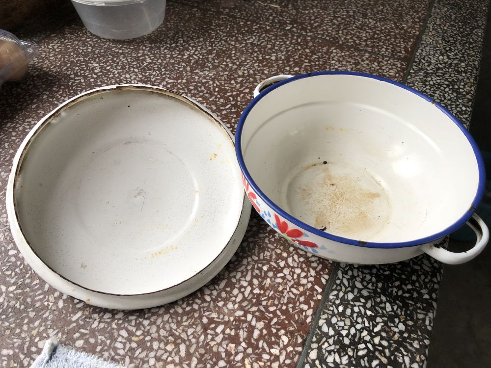 大多数同学吃饭用的碗是那个年代最常用的搪瓷碗,有一大一小的,也有两个一样大的。两个碗放入碗袋,拎着走路时会有碗碰撞的特有声音。也有用铝饭盒的,本人用的是一个比大碗稍大点的小盆(见图,母亲一直替我保存着)。