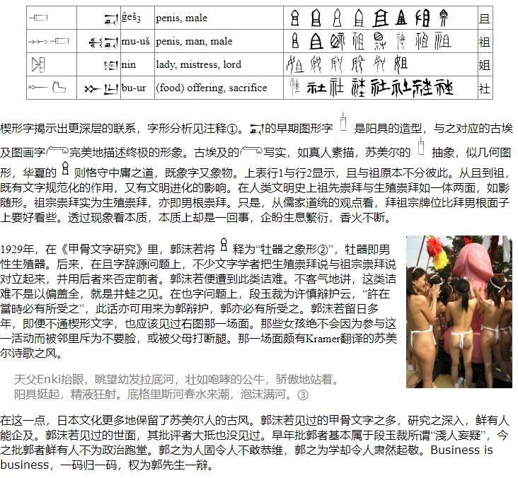 字形上的连续性与字义上的流动性亦并行不悖。形与义两个维度上的并行不悖暗示,姐的本义不是姐妹之姐,其义更接近许慎所谓“蜀謂母曰姐”,甚至更进一步,女性祖先。《周礼·考工记·匠人》里有,“左祖右社”。华夏文化里向有男左女右之说,据此,这可以解释为,左为男性先辈,右为女性先辈。归纳起来,在祖先这一意义上,姐与祖为两性对偶字,在祭祀这一意义上,祖与社为两性对偶字。这一总结得到甲骨文字的直接支持,也得到苏美尔楔形文字的间接支持。