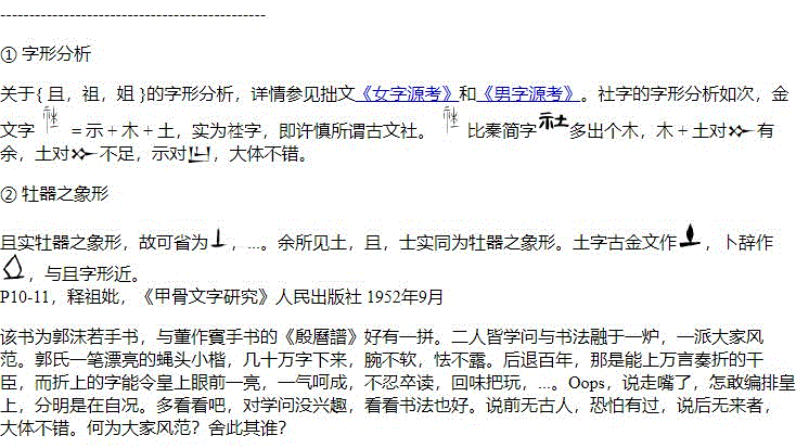 从现象学的观点看,文献充斥赢家叙事,传说饱含民间情绪,赢家动辄焚书坑儒,民间喜欢造神依附。无论赢家叙事,还是民间情绪,道德与八卦共存,真人与鬼神不分。二八扣着听尚显不足,三七扣也未必保险。相比之下,文字更可靠。虽然字义容易流变,字形却如化石。三千年前的字形透露三千年前的信息。后人无论如何解读,甚至伪托,终不能扭曲其朴拙的原形。不过,文献记载里有两点值得注意,一,彡姐 = 彡且,二,彡且 = ????。这两个等式可以找到古文字形的支持。