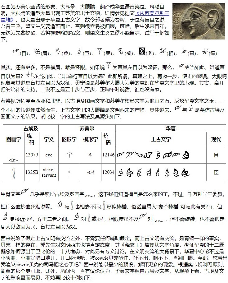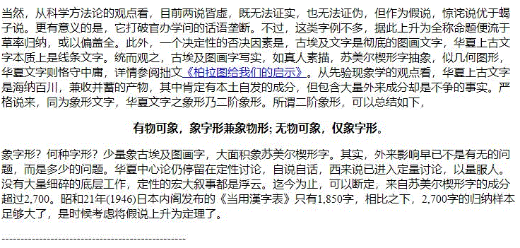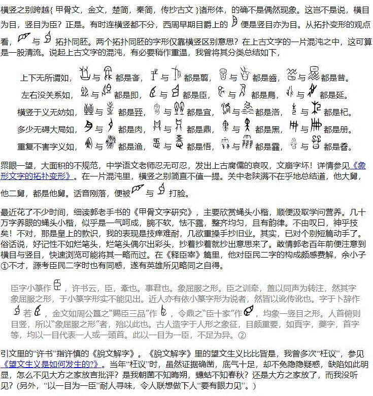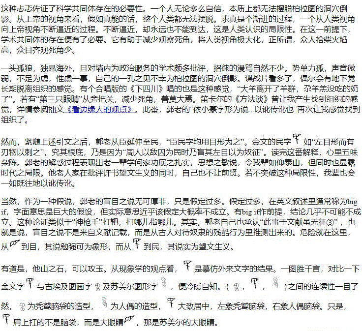判断象形文字主要靠视觉,而视觉受主观意识影响颇大。批评理性主义认为,你可能是对的,我可能是错的,你我联手,可能更接近真理。郭沫若腕儿虽大,对他我也是这种态度。自源论不同,那是官办学问的观点。官吗,说你象你就象,不象也象; 说不象就不象,象也不象。第三只眼睛的观点则相对客观,你的评论颇有第三只眼睛的意思。可以再说透点,顺我之处,我不会自得,逆我之处,我不会恼怒。