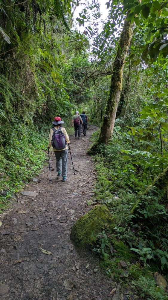 入口还有边境检查,要看护照。进去以后,大家上厕所,抹防晒霜,喷驱蚊剂。我和领导把绑腿(gaiter)带上。胖姐姐看到了,问这是什么?我跟她解释,这是为了防止小石子进鞋里。她说,你们这么专业啊?然后我把一个沙网头罩带上,防蚊子。那位加拿大男士不淡定了:你有点失控啊(You are out of control)。我和他讲了我以前在背包徒步时被成千上百只蚊子追着咬的经历。一路上有不少人看到我的头罩发出微笑。我才不管它。印加古道徒步就这样开始了。没有太阳,也没下雨,气温大约60F度,在印加古道的林荫道上走得真惬意。